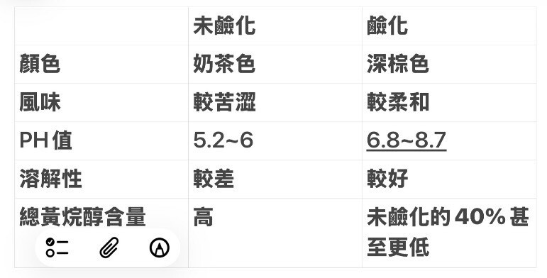 可可粉又可分成兩大類別:未鹼化、鹼化。可從顏色、PH值、溶解性、總黃烷醇含量等面向概略比較: